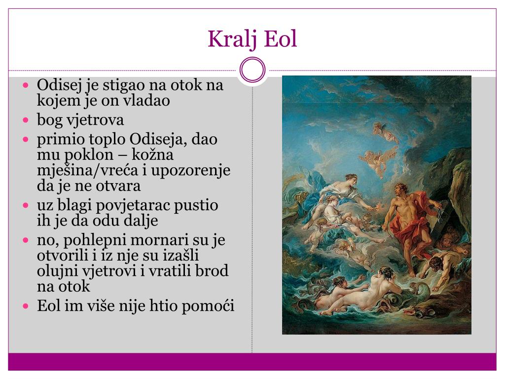 Kralj Eol Odisej je stigao na otok na kojem je on vladao bog vjetrova primio toplo Odiseja, dao mu poklon – kožna mješina/vreća i upozorenje da je ne otvara uz blagi povjetarac pustio ih je da odu dalje no, pohlepni mornari su je otvorili i iz nje su izašli olujni vjetrovi i vratili brod na otok Eol im više nije htio pomoći