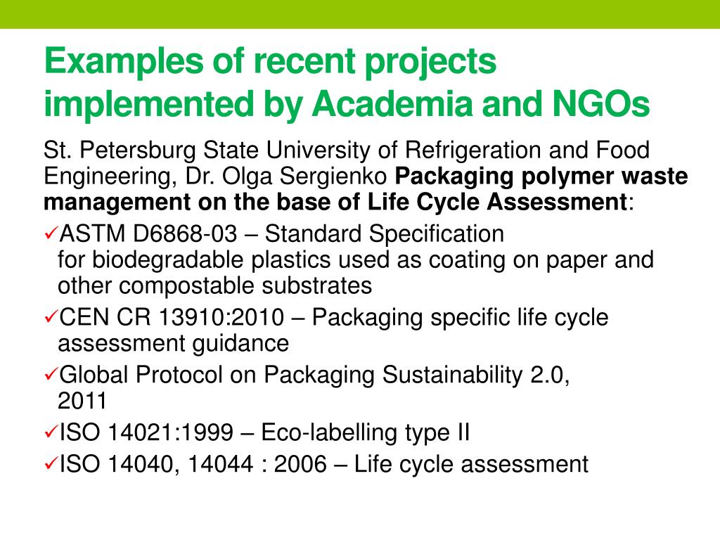 Examples of recent projects implemented by Academia and NGOs St. Petersburg State University of Refrigeration and Food Engineering, Dr. Olga SergienkoPackaging polymer waste management on the base of Life Cycle Assessment: • ASTM D6868-03 – Standard Specification for biodegradable plastics used as coating on paper and other compostable substrates • CEN CR 13910:2010 – Packaging specific life cycle assessment guidance • Global Protocol on Packaging Sustainability 2.0,2011 • ISO 14021:1999 – Eco-labelling type II • ISO 14040, 14044 : 2006 – Life cycle assessment
