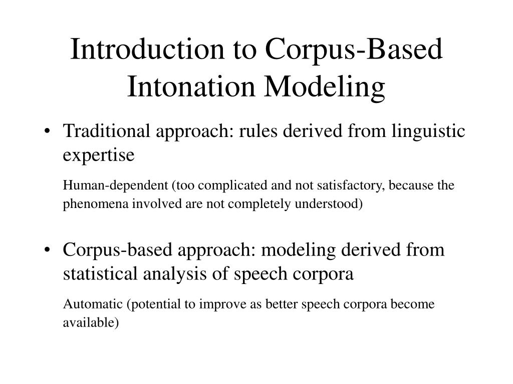 Introduction to Corpus-Based Intonation Modeling • Traditional approach: rules derived from linguistic expertise Human-dependent (too complicated and not satisfactory, because the phenomena involved are not completely understood) • Corpus-based approach: modeling derived from statistical analysis of speech corpora Automatic (potential to improve as better speech corpora become available)