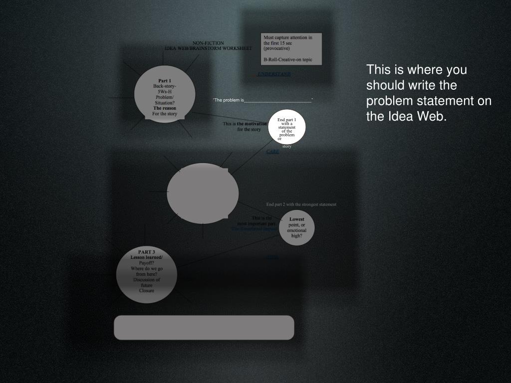 The emotional impact works best in this location in the story.Save the strongest statement about the problem and place it in this part of the Idea WebWe want the viewer to feel the strongest emotion here. “The problem is___________________________” End part 1 with a statement of the problem or conflict in the story Part 2 Explore the details about the problem. Discuss the issues surrounding the conflicts. Arrange ideas from least to most important to the story End part 2 with the strongest statement Convert the ideas from your “brain-storm” from this idea web into a bulleted outline.
