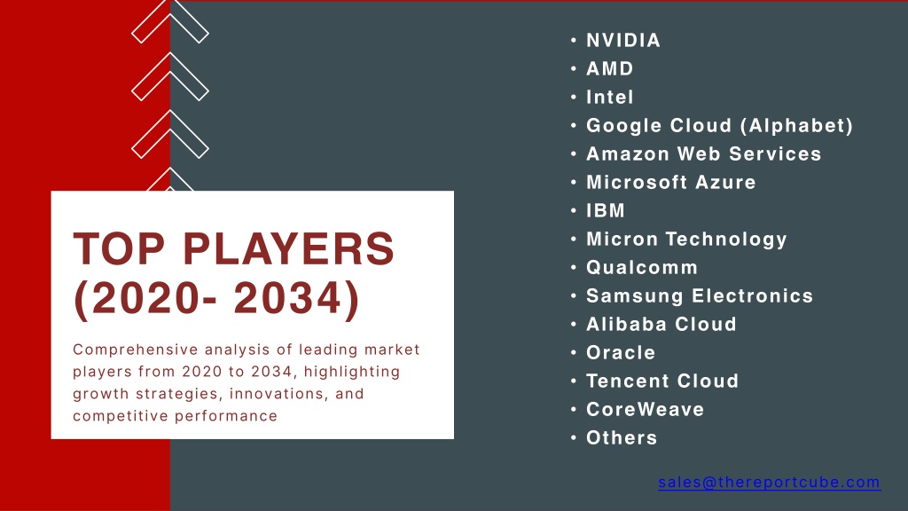 5. sales@thereportcube.com • NVIDIA • AMD • Intel • Google Cloud (Alphabet) • Amazon Web Services • Microsoft Azure • IBM • Micron Technology • Qualcomm • Samsung Electronics • Alibaba Cloud • Oracle • Tencent Cloud • CoreWeave • Others • TOP PLAYERS • (2020- 2034) • Comprehensive analysis of leading market players from 2020 to 2034, highlighting growth strategies, innovations, and competitive performance