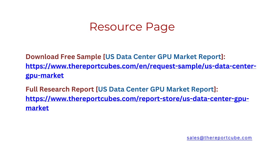 7. sales@thereportcube.com • Resource Page Download Free Sample [US Data Center GPU Market Report]: https://www.thereportcubes.com/en/request-sample/us-data-center-gpu-market Full Research Report [US Data Center GPU Market Report]: https://www.thereportcubes.com/report-store/us-data-center-gpu-market