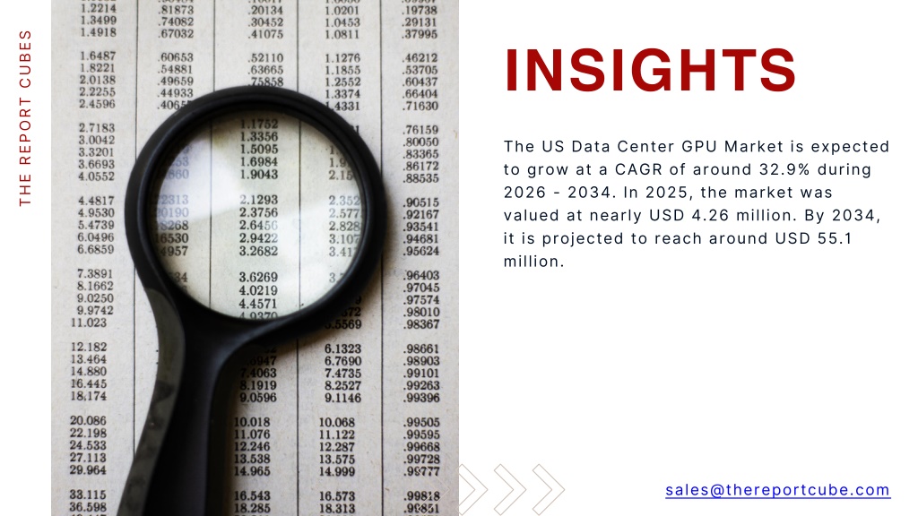 2. sales@thereportcube.com • INSIGHTS • The US Data Center GPU Market is expected to grow at a CAGR of around 32.9% during 2026 - 2034. In 2025, the market was valued at nearly USD 4.26 million. By 2034, it is projected to reach around USD 55.1 million. • THE REPORT CUBES