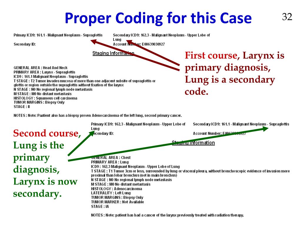 Proper Coding for this Case 32 First course, Larynx is primary diagnosis, Lung is a secondary code. Second course, Lung is the primary diagnosis, Larynx is now secondary.
