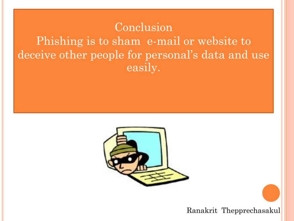 Conclusion Phishing is to sham e-mail or website to deceive other people for personal’s data and use easily. RanakritThepprechasakul