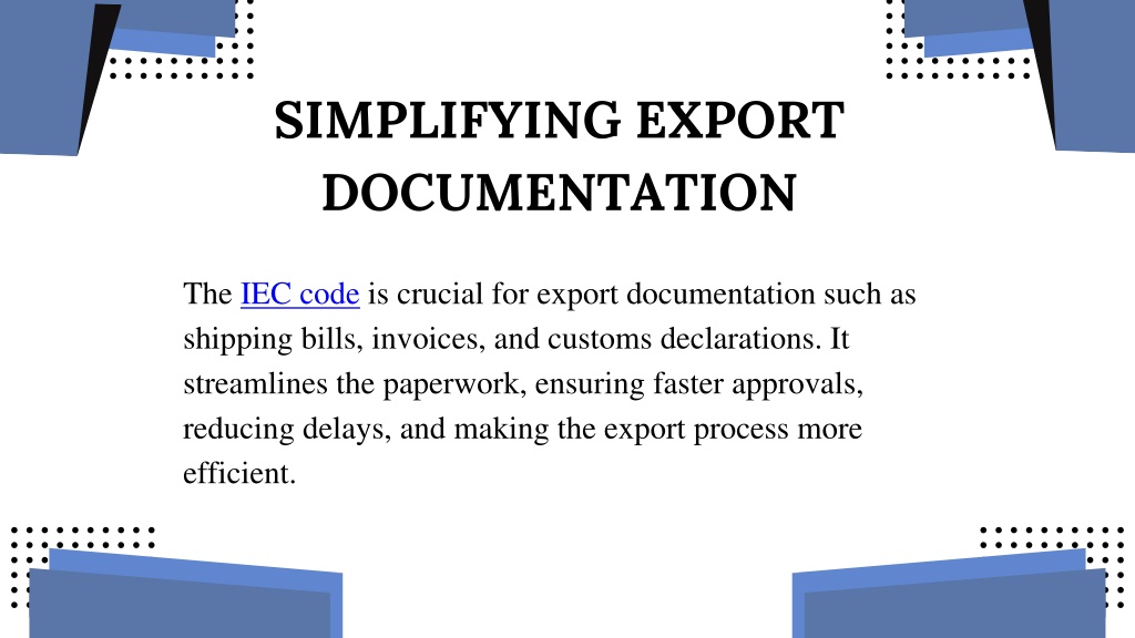 SIMPLIFYING EXPORT DOCUMENTATION The IEC code is crucial for export documentation such as shipping bills, invoices, and customs declarations. It streamlines the paperwork, ensuring faster approvals, reducing delays, and making the export process more efficient.