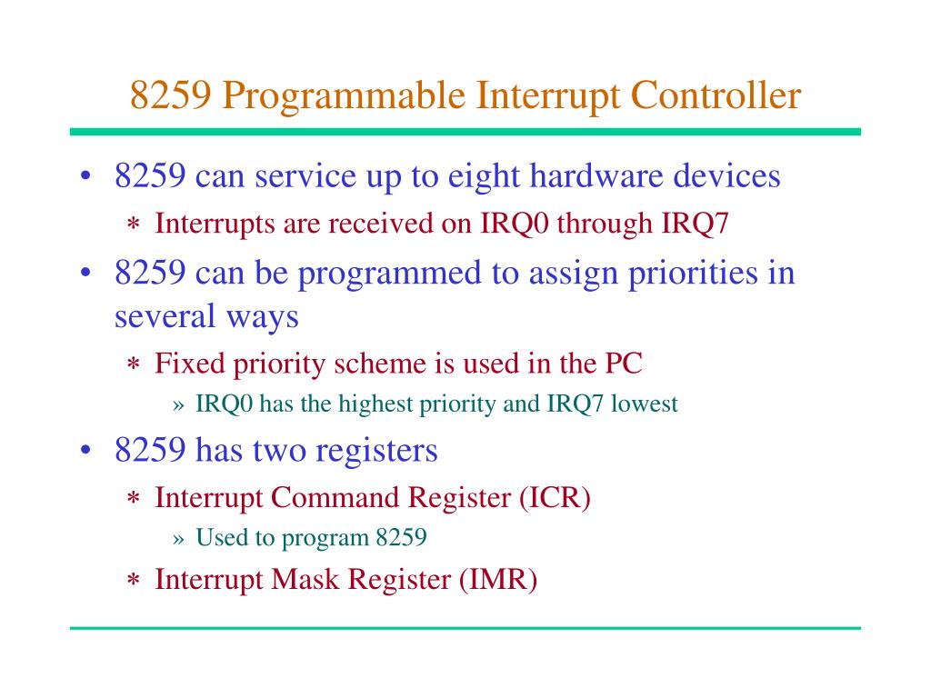 8259 Programmable Interrupt Controller • 8259 can service up to eight hardware devices • Interrupts are received on IRQ0 through IRQ7 • 8259 can be programmed to assign priorities in several ways • Fixed priority scheme is used in the PC • IRQ0 has the highest priority and IRQ7 lowest • 8259 has two registers • Interrupt Command Register (ICR) • Used to program 8259 • Interrupt Mask Register (IMR)