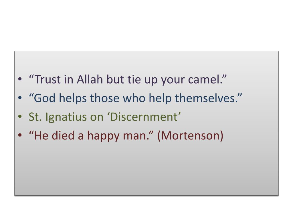 “Trust in Allah but tie up your camel.” • “God helps those who help themselves.” • St. Ignatius on ‘Discernment’ • “He died a happy man.” (Mortenson)