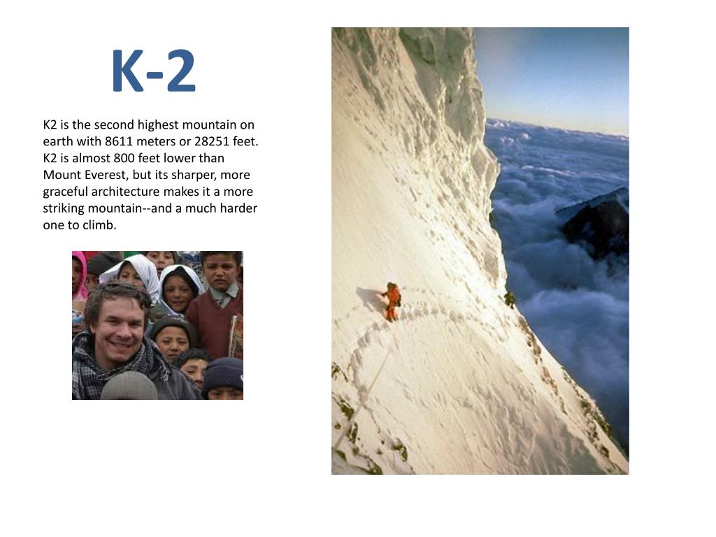 K-2 K2 is the second highest mountain on earth with 8611 meters or 28251 feet. K2 is almost 800 feet lower than Mount Everest, but its sharper, more graceful architecture makes it a more striking mountain--and a much harder one to climb.