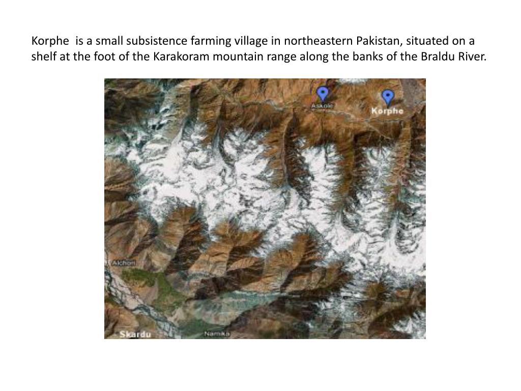 Korphe is a small subsistence farming village in northeastern Pakistan, situated on a shelf at the foot of the Karakoram mountain range along the banks of the Braldu River.