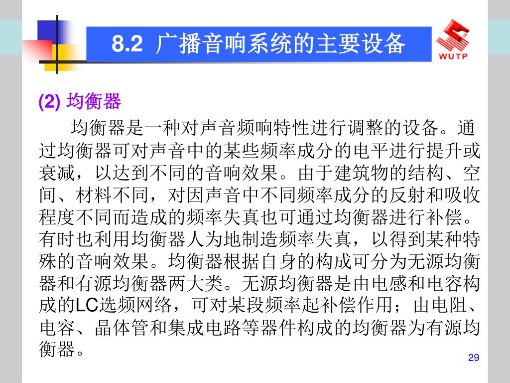 8.2 广播音响系统的主要设备 • (2) 均衡器 • 均衡器是一种对声音频响特性进行调整的设备。通过均衡器可对声音中的某些频率成分的电平进行提升或衰减,以达到不同的音响效果。由于建筑物的结构、空间、材料不同,对因声音中不同频率成分的反射和吸收程度不同而造成的频率失真也可通过均衡器进行补偿。有时也利用均衡器人为地制造频率失真,以得到某种特殊的音响效果。均衡器根据自身的构成可分为无源均衡器和有源均衡器两大类。无源均衡器是由电感和电容构成的LC选频网络,可对某段频率起补偿作用;由电阻、电容、晶体管和集成电路等器件构成的均衡器为有源均衡器。
