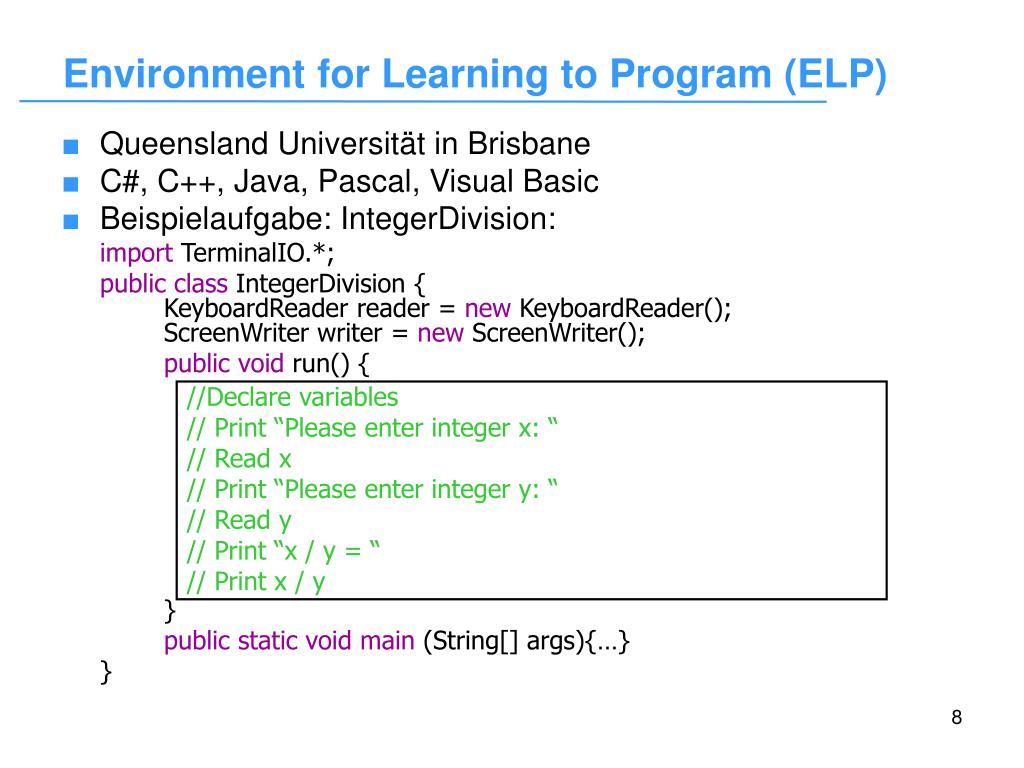 Environment for Learning to Program (ELP) • Queensland Universität in Brisbane • C#, C++, Java, Pascal, Visual Basic • Beispielaufgabe: IntegerDivision: import TerminalIO.*; publicclass IntegerDivision { KeyboardReader reader = new KeyboardReader(); ScreenWriter writer = new ScreenWriter(); public void run() { } public static void main (String[] args){…} } //Declare variables // Print “Please enter integer x: “ // Read x // Print “Please enter integer y: “ // Read y // Print “x / y = “ // Print x / y