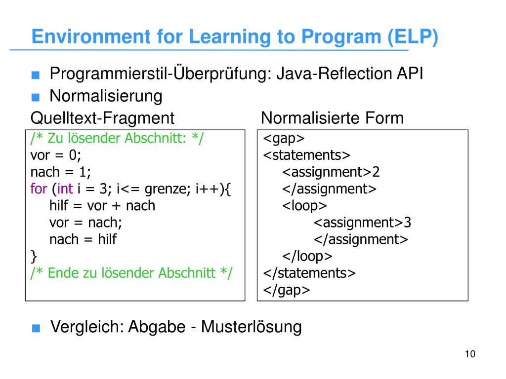 Environment for Learning to Program (ELP) • Programmierstil-Überprüfung: Java-Reflection API • Normalisierung Quelltext-Fragment /* Zu lösender Abschnitt: */ vor = 0; nach = 1; for (int i = 3; i<= grenze; i++){ hilf = vor + nach vor = nach; nach = hilf } /* Ende zu lösender Abschnitt */