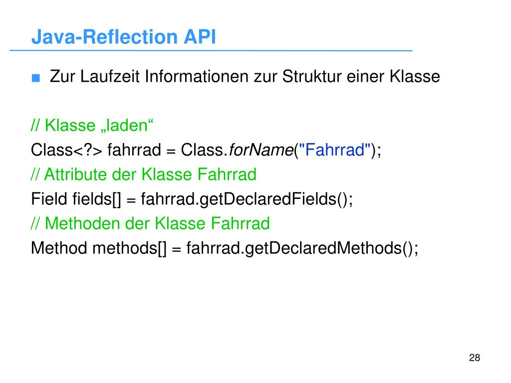 Java-Reflection API • Zur Laufzeit Informationen zur Struktur einer Klasse // Klasse „laden“ Class<?> fahrrad = Class.forName("Fahrrad"); // Attribute der Klasse Fahrrad Field fields[] = fahrrad.getDeclaredFields(); // Methoden der Klasse Fahrrad Method methods[] = fahrrad.getDeclaredMethods();