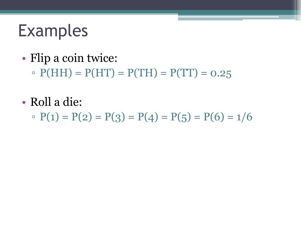 Examples • Flip a coin twice: • P(HH) = P(HT) = P(TH) = P(TT) = 0.25 • Roll a die: • P(1) = P(2) = P(3) = P(4) = P(5) = P(6) = 1/6