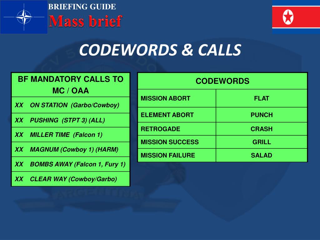 MSSN. OBJECTIVES • ALL • DESTROY Sondok Air Base. • SURVIVE. • NO FRATICIDES. • STRIKER (th) • DESTROY RWY at Tgt Site. • DESTROY Hangar & Control Twr. • 50 % BOTOT. • ENGAGE IN ACCORDENCE WITH A-G ROE. • SEAD STRIKE (th) • DESTROY “SA 2/SA 3 /AAA” • ENGAGE IN ACCORDENCE WITH A-G ROE. • ESCORT/SWEEP (th) • INTERCEPT AND DESTROY ALL HOSTILE AIRCRAFT. • NO LEAKERS. • ENGAGE IN ACCORDENCE WITH A-A ROE.