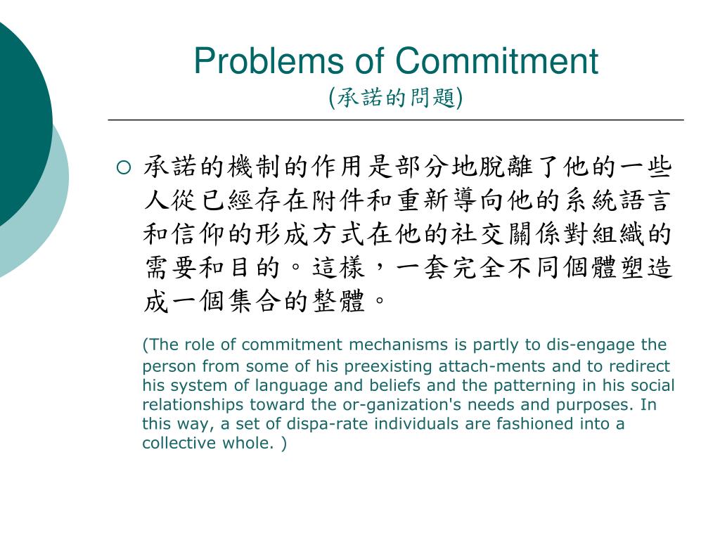 Problems of Commitment(承諾的問題) • 承諾的機制的作用是部分地脫離了他的一些人從已經存在附件和重新導向他的系統語言和信仰的形成方式在他的社交關係對組織的需要和目的。這樣,一套完全不同個體塑造成一個集合的整體。 (The role of commitment mechanisms is partly to dis-engage the person from some of his preexisting attach-ments and to redirect his system of language and beliefs and the patterning in his social relationships toward the or-ganization's needs and purposes. In this way, a set of dispa-rate individuals are fashioned into a collective whole. )