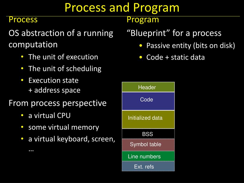 Process and Program Header Code Initialized data BSS Symbol table Line numbers Ext. refs • Process • OS abstraction of a running computation • The unit of execution • The unit of scheduling • Execution state+ address space • From process perspective • a virtual CPU • some virtual memory • a virtual keyboard, screen, … • Program • “Blueprint” for a process • Passive entity (bits on disk) • Code + static data