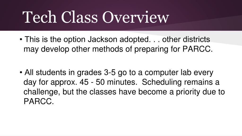 Tech Class Overview • This is the option Jackson adopted. . . other districts may develop other methods of preparing for PARCC. • All students in grades 3-5 go to a computer lab every day for approx. 45 - 50 minutes. Scheduling remains a challenge, but the classes have become a priority due to PARCC.