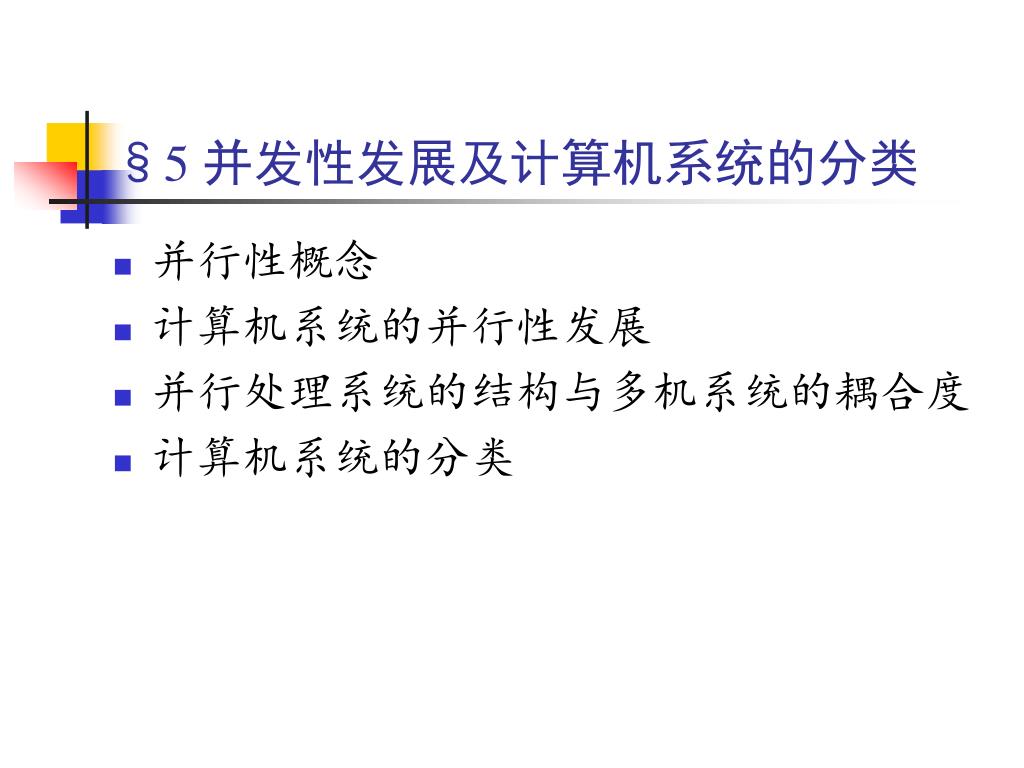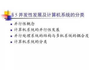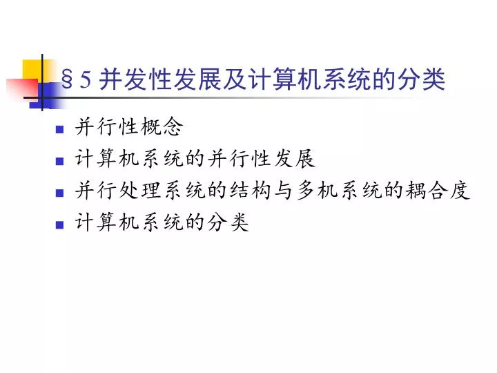 §5 并发性发展及计算机系统的分类 • 并行性概念 • 计算机系统的并行性发展 • 并行处理系统的结构与多机系统的耦合度 • 计算机系统的分类