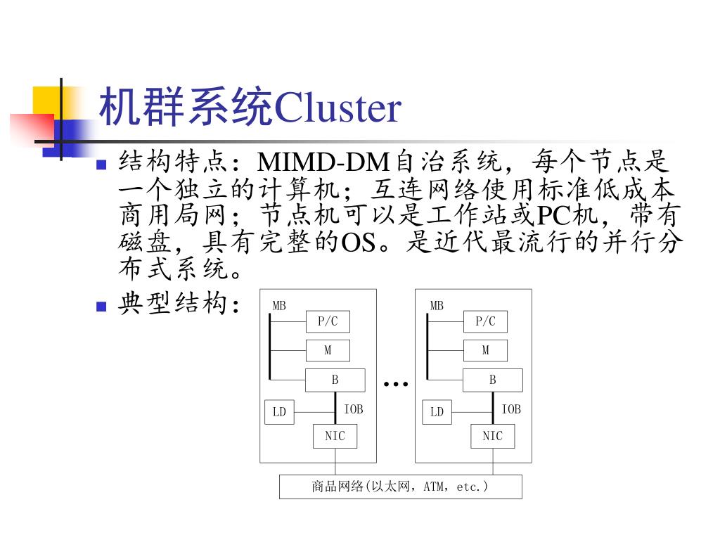 机群系统Cluster 结构特点:MIMD-DM自治系统,每个节点是一个独立的计算机;互连网络使用标准低成本商用局网;节点机可以是工作站或PC机,带有磁盘,具有完整的OS。是近代最流行的并行分布式系统。 典型结构: