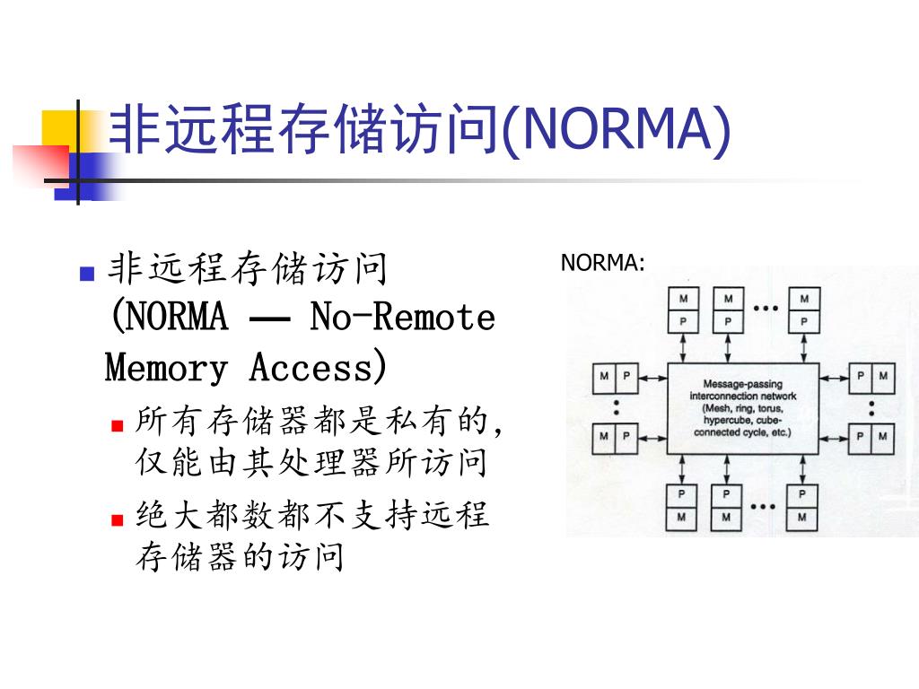 非远程存储访问(NORMA) NORMA: • 非远程存储访问(NORMA — No-Remote Memory Access) • 所有存储器都是私有的,仅能由其处理器所访问 • 绝大都数都不支持远程存储器的访问