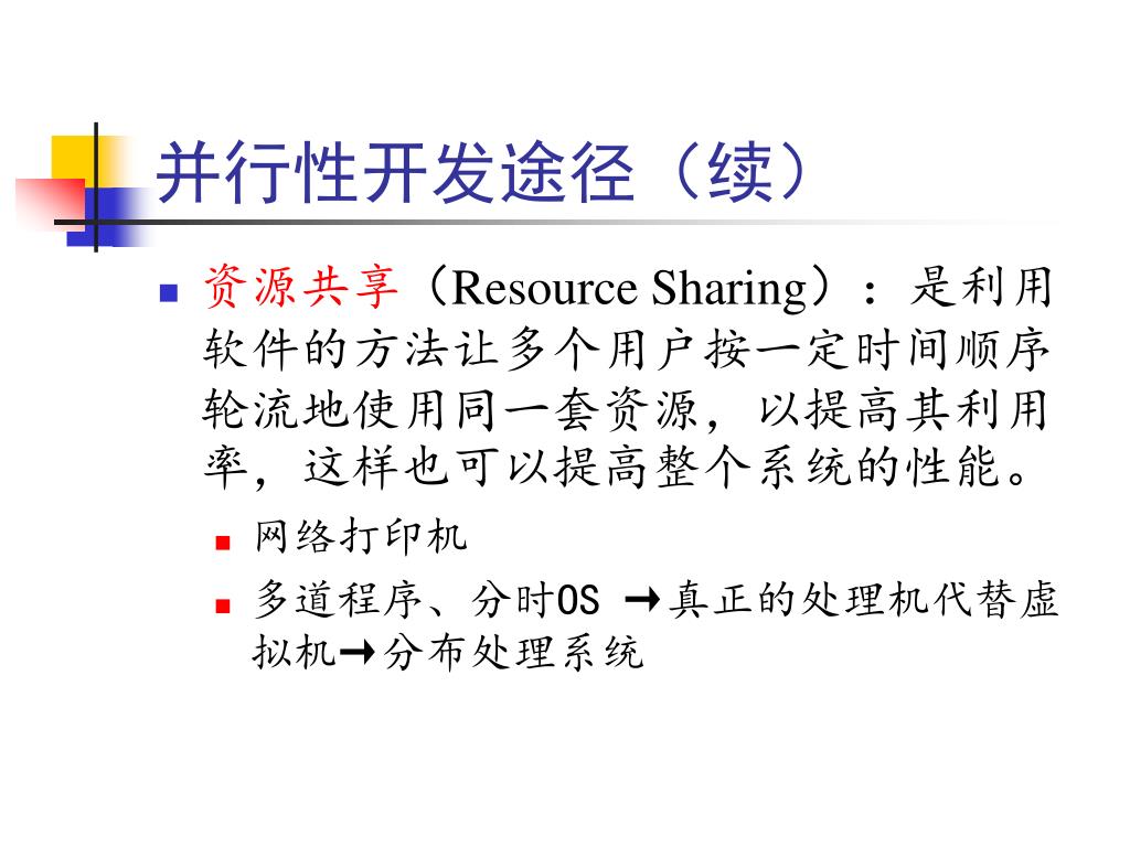 并行性开发途径(续) • 资源共享(Resource Sharing):是利用软件的方法让多个用户按一定时间顺序轮流地使用同一套资源,以提高其利用率,这样也可以提高整个系统的性能。 • 网络打印机 • 多道程序、分时OS →真正的处理机代替虚拟机→分布处理系统