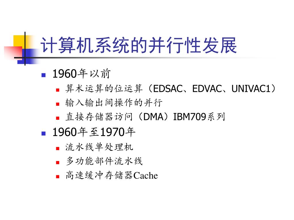 计算机系统的并行性发展 • 1960年以前 • 算术运算的位运算(EDSAC、EDVAC、UNIVAC1) • 输入输出间操作的并行 • 直接存储器访问(DMA)IBM709系列 • 1960年至1970年 • 流水线单处理机 • 多功能部件流水线 • 高速缓冲存储器Cache