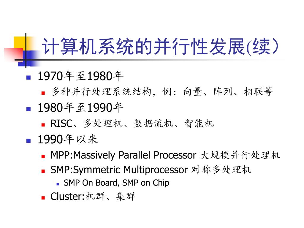 计算机系统的并行性发展(续) • 1970年至1980年 • 多种并行处理系统结构,例:向量、阵列、相联等 • 1980年至1990年 • RISC、多处理机、数据流机、智能机 • 1990年以来 • MPP:Massively Parallel Processor 大规模并行处理机 • SMP:Symmetric Multiprocessor 对称多处理机 • SMP On Board, SMP on Chip • Cluster:机群、集群