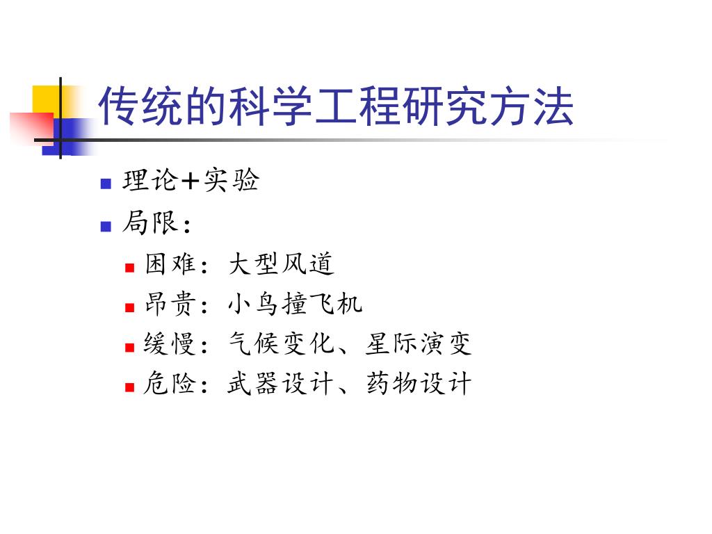 传统的科学工程研究方法 • 理论+实验 • 局限: • 困难:大型风道 • 昂贵:小鸟撞飞机 • 缓慢:气候变化、星际演变 • 危险:武器设计、药物设计