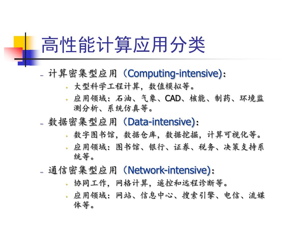 高性能计算应用分类 • 计算密集型应用(Computing-intensive): • 大型科学工程计算,数值模拟等。 • 应用领域:石油、气象、CAD、核能、制药、环境监测分析、系统仿真等。 • 数据密集型应用(Data-intensive): • 数字图书馆,数据仓库,数据挖掘,计算可视化等。 • 应用领域:图书馆、银行、证券、税务、决策支持系统等。 • 通信密集型应用(Network-intensive): • 协同工作,网格计算,遥控和远程诊断等。 • 应用领域:网站、信息中心、搜索引擎、电信、流媒体等。