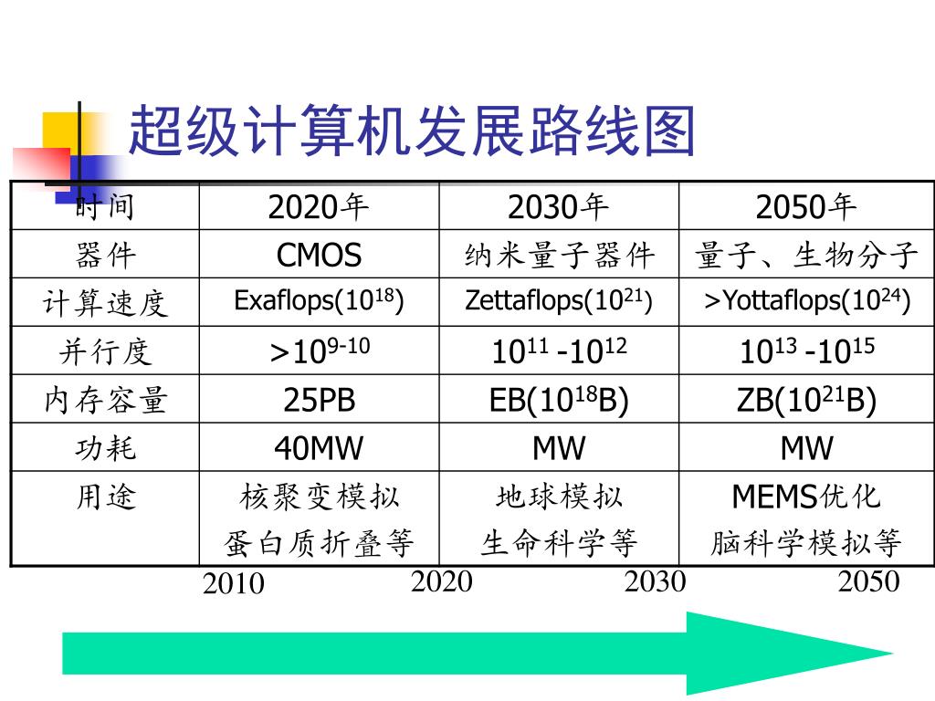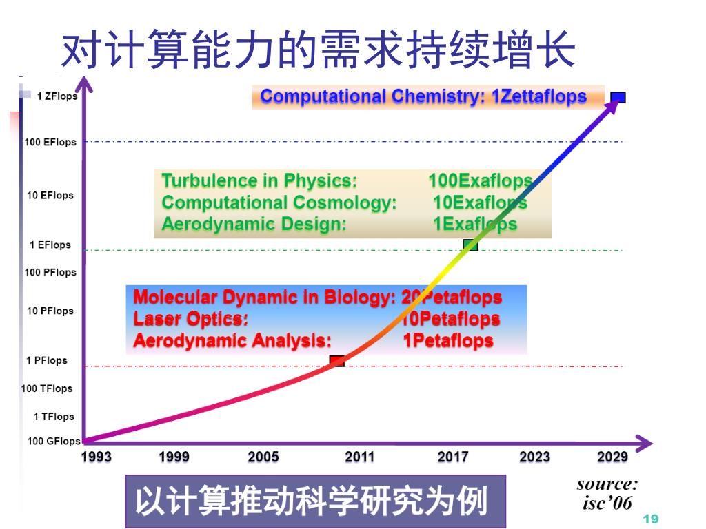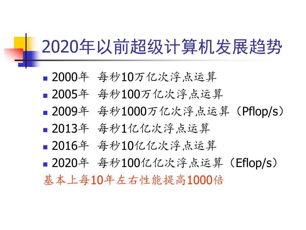 2020年以前超级计算机发展趋势 2000年 每秒10万亿次浮点运算 2005年 每秒100万亿次浮点运算 2009年 每秒1000万亿次浮点运算(Pflop/s) 2013年 每秒1亿亿次浮点运算 2016年 每秒10亿亿次浮点运算 2020年 每秒100亿亿次浮点运算(Eflop/s) 基本上每10年左右性能提高1000倍