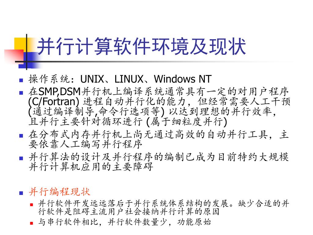 并行计算软件环境及现状 • 操作系统:UNIX、LINUX、Windows NT • 在SMP,DSM并行机上编译系统通常具有一定的对用户程序(C/Fortran) 进程自动并行化的能力,但经常需要人工干预 (通过编译制导,命令行选项等) 以达到理想的并行效率,且并行主要针对循环进行 (属于细粒度并行) • 在分布式内存并行机上尚无通过高效的自动并行工具,主要依靠人工编写并行程序 • 并行算法的设计及并行程序的编制已成为目前特约大规模并行计算机应用的主要障碍 • 并行编程现状 • 并行软件开发远远落后于并行系统体系结构的发展。缺少合适的并行软件是阻碍主流用户社会接纳并行计算的原因 • 与串行软件相比,并行软件数量少,功能原始