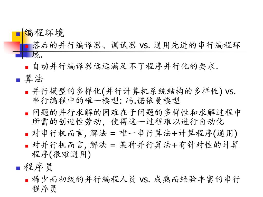 编程环境 • 落后的并行编译器、调试器 vs. 通用先进的串行编程环境. • 自动并行编译器远远满足不了程序并行化的要求. • 算法 • 并行模型的多样化(并行计算机系统结构的多样性) vs. 串行编程中的唯一模型: 冯.诺依曼模型 • 问题的并行求解的困难在于问题的多样性和求解过程中所需的创造性劳动,使得这一过程难以进行自动化 • 对串行机而言, 解法 = 唯一串行算法+计算程序(通用) • 对并行机而言, 解法 = 某种并行算法+有针对性的计算程序(很难通用) • 程序员 • 稀少而初级的并行编程人员 vs. 成熟而经验丰富的串行程序员