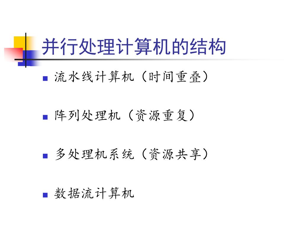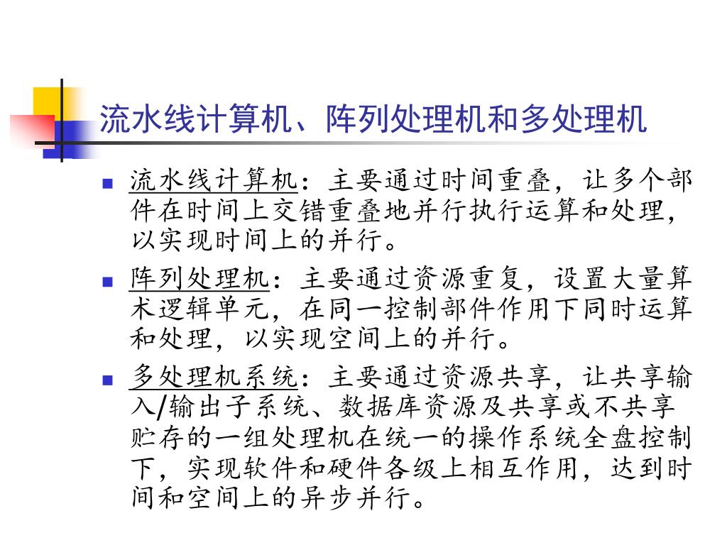 流水线计算机、阵列处理机和多处理机 • 流水线计算机:主要通过时间重叠,让多个部件在时间上交错重叠地并行执行运算和处理,以实现时间上的并行。 • 阵列处理机:主要通过资源重复,设置大量算术逻辑单元,在同一控制部件作用下同时运算和处理,以实现空间上的并行。 • 多处理机系统:主要通过资源共享,让共享输入/输出子系统、数据库资源及共享或不共享贮存的一组处理机在统一的操作系统全盘控制下,实现软件和硬件各级上相互作用,达到时间和空间上的异步并行。