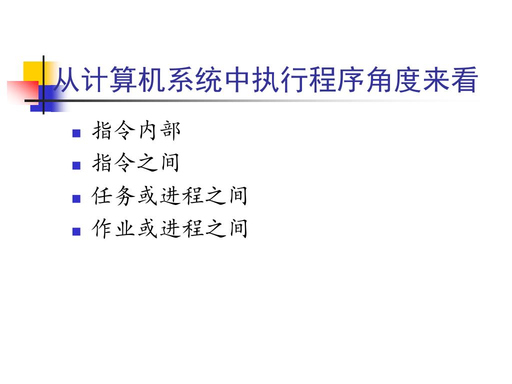 从计算机系统中执行程序角度来看 • 指令内部 • 指令之间 • 任务或进程之间 • 作业或进程之间
