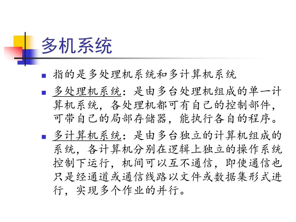 多机系统 • 指的是多处理机系统和多计算机系统 • 多处理机系统:是由多台处理机组成的单一计算机系统,各处理机都可有自己的控制部件,可带自己的局部存储器,能执行各自的程序。 • 多计算机系统:是由多台独立的计算机组成的系统,各计算机分别在逻辑上独立的操作系统控制下运行,机间可以互不通信,即使通信也只是经通道或通信线路以文件或数据集形式进行,实现多个作业的并行。