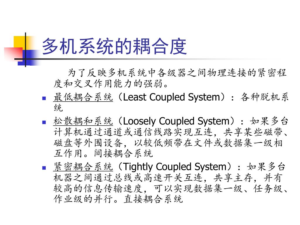 多机系统的耦合度 为了反映多机系统中各级器之间物理连接的紧密程度和交叉作用能力的强弱。 • 最低耦合系统(Least Coupled System):各种脱机系统 • 松散耦和系统(Loosely Coupled System):如果多台计算机通过通道或通信线路实现互连,共享某些磁带、磁盘等外围设备,以较低频带在文件或数据集一级相互作用。间接耦合系统 • 紧密耦合系统(Tightly Coupled System):如果多台机器之间通过总线或高速开关互连,共享主存,并有较高的信息传输速度,可以实现数据集一级、任务级、作业级的并行。直接耦合系统