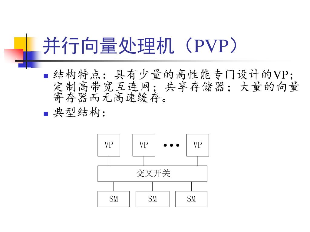 并行向量处理机(PVP) 结构特点:具有少量的高性能专门设计的VP;定制高带宽互连网;共享存储器;大量的向量寄存器而无高速缓存。 典型结构: