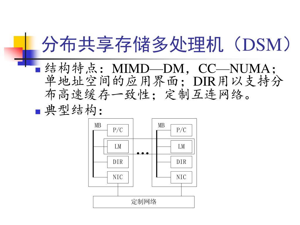 分布共享存储多处理机(DSM) 结构特点:MIMD—DM,CC—NUMA;单地址空间的应用界面;DIR用以支持分布高速缓存一致性;定制互连网络。 典型结构: