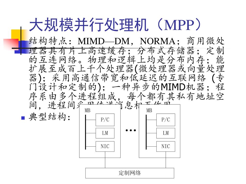 大规模并行处理机(MPP) 结构特点:MIMD—DM,NORMA;商用微处理器具有片上高速缓存;分布式存储器;定制的互连网络。物理和逻辑上均是分布内存;能扩展至成百上千个处理器(微处理器或向量处理器);采用高通信带宽和低延迟的互联网络 (专门设计和定制的);一种异步的MIMD机器;程序系由多个进程组成,每个都有其私有地址空间,进程间采用传递消息相互作用; 典型结构: