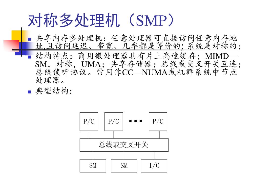 对称多处理机(SMP) 共享内存多处理机:任意处理器可直接访问任意内存地址,且访问延迟、带宽、几率都是等价的; 系统是对称的; 结构特点:商用微处理器具有片上高速缓存;MIMD—SM,对称,UMA;共享存储器;总线或交叉开关互连;总线侦听协议。常用作CC—NUMA或机群系统中节点处理器。 典型结构: