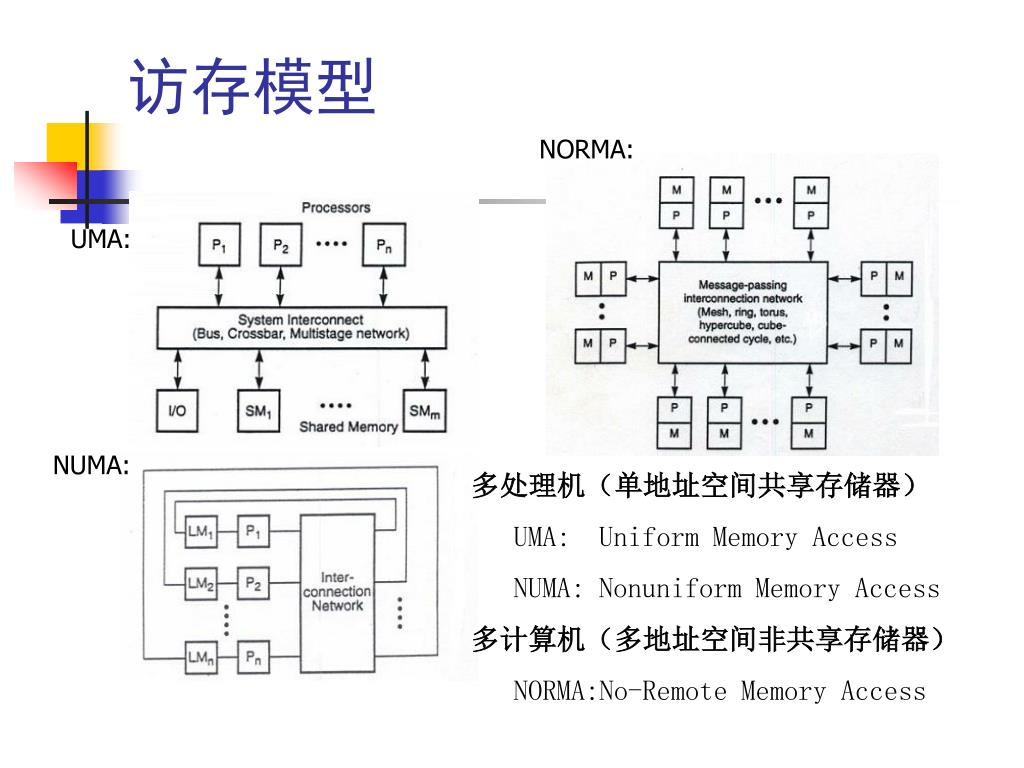 访存模型 NORMA: UMA: NUMA: 多处理机(单地址空间共享存储器) UMA: Uniform Memory Access NUMA: Nonuniform Memory Access 多计算机(多地址空间非共享存储器) NORMA:No-Remote Memory Access