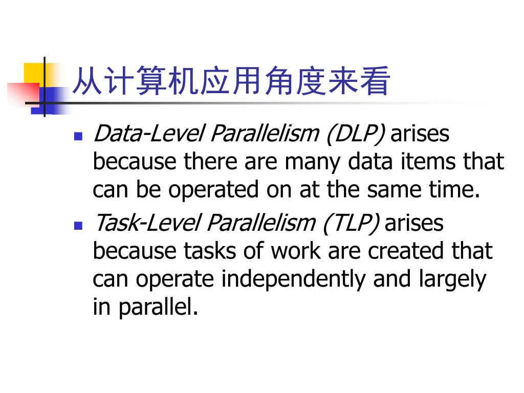 从计算机应用角度来看 • Data-Level Parallelism (DLP) arises because there are many data items that can be operated on at the same time. • Task-Level Parallelism (TLP) arises because tasks of work are created that can operate independently and largely in parallel.