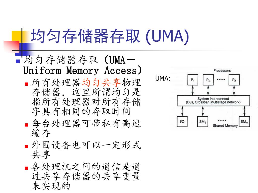 均匀存储器存取 (UMA) UMA: • 均匀存储器存取(UMA-Uniform Memory Access) • 所有处理器均匀共享物理存储器,这里所谓均匀是指所有处理器对所有存储字具有相同的存取时间 • 每台处理器可带私有高速缓存 • 外围设备也可以一定形式共享 • 各处理机之间的通信是通过共享存储器的共享变量来实现的 • 这一类多处理机由于对资源的高度共享,常称紧耦合系统(tightly coupled system)