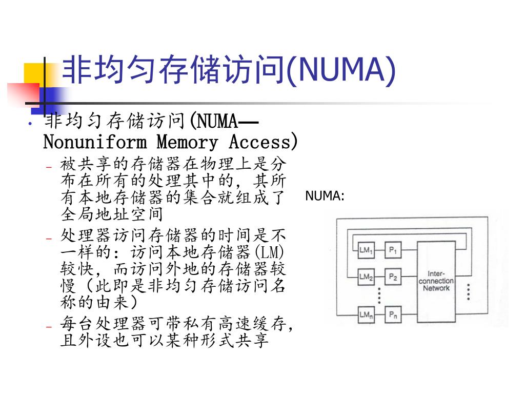 非均匀存储访问(NUMA) NUMA: • 非均匀存储访问(NUMA—Nonuniform Memory Access) • 被共享的存储器在物理上是分布在所有的处理其中的,其所有本地存储器的集合就组成了全局地址空间 • 处理器访问存储器的时间是不一样的:访问本地存储器(LM)较快,而访问外地的存储器较慢(此即是非均匀存储访问名称的由来) • 每台处理器可带私有高速缓存,且外设也可以某种形式共享