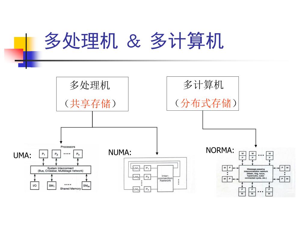 多处理机 & 多计算机 UMA: NORMA: NUMA: 多计算机 (分布式存储) 多处理机 (共享存储)