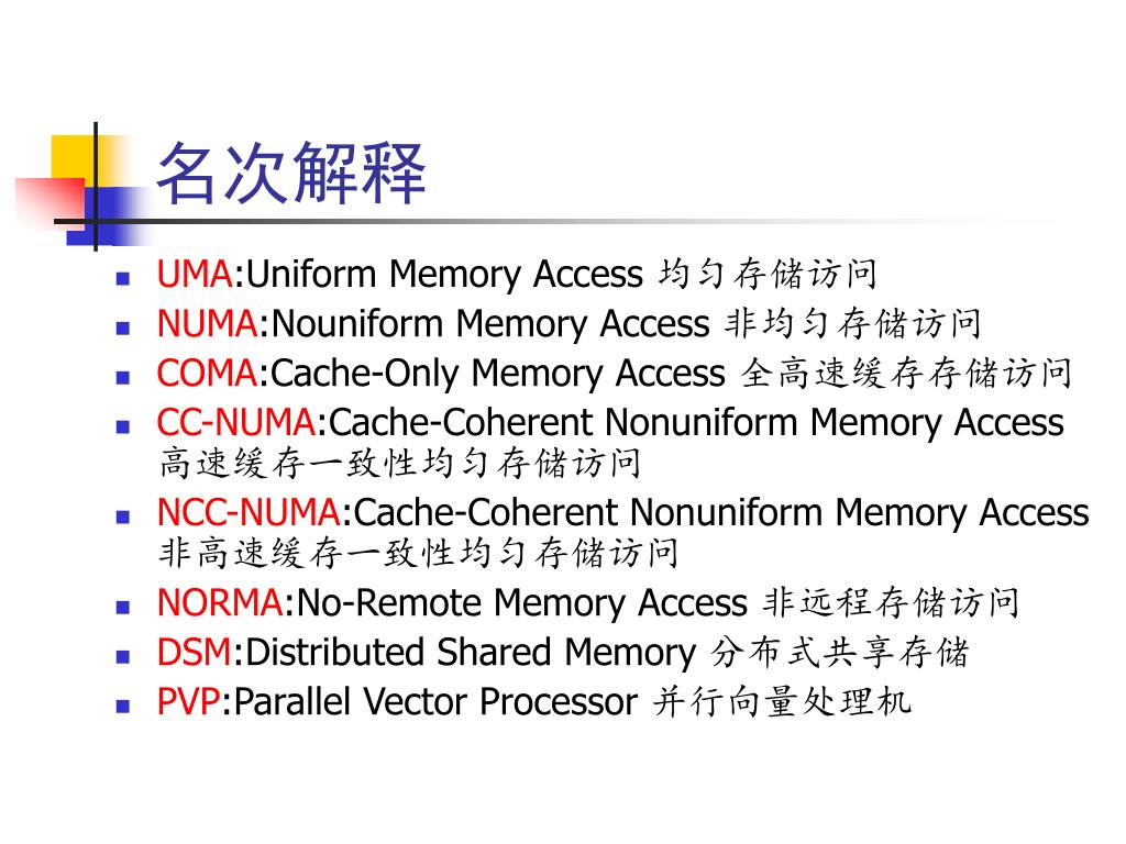名次解释 • UMA:Uniform Memory Access 均匀存储访问 • NUMA:Nouniform Memory Access 非均匀存储访问 • COMA:Cache-Only Memory Access 全高速缓存存储访问 • CC-NUMA:Cache-Coherent Nonuniform Memory Access 高速缓存一致性均匀存储访问 • NCC-NUMA:Cache-Coherent Nonuniform Memory Access 非高速缓存一致性均匀存储访问 • NORMA:No-Remote Memory Access 非远程存储访问 • DSM:Distributed Shared Memory 分布式共享存储 • PVP:Parallel Vector Processor 并行向量处理机