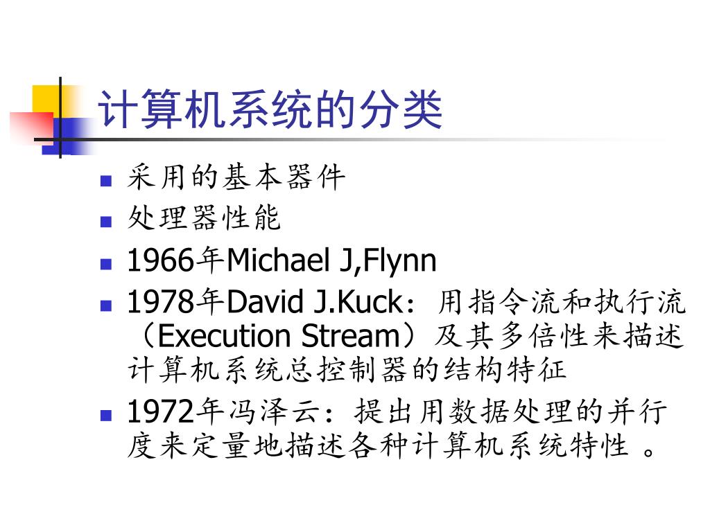 计算机系统的分类 • 采用的基本器件 • 处理器性能 • 1966年Michael J,Flynn • 1978年David J.Kuck:用指令流和执行流(Execution Stream)及其多倍性来描述计算机系统总控制器的结构特征 • 1972年冯泽云:提出用数据处理的并行度来定量地描述各种计算机系统特性 。