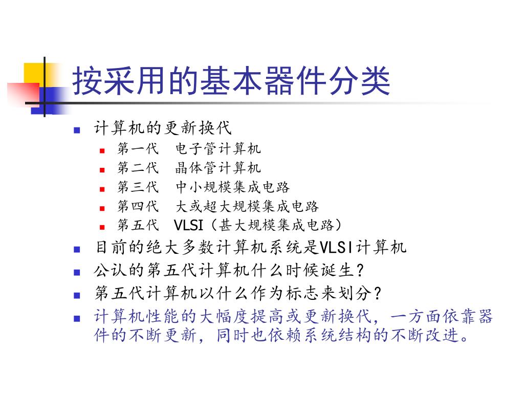 按采用的基本器件分类 • 计算机的更新换代 • 第一代 电子管计算机 • 第二代 晶体管计算机 • 第三代 中小规模集成电路 • 第四代 大或超大规模集成电路 • 第五代 VLSI(甚大规模集成电路) • 目前的绝大多数计算机系统是VLSI计算机 • 公认的第五代计算机什么时候诞生? • 第五代计算机以什么作为标志来划分? • 计算机性能的大幅度提高或更新换代,一方面依靠器件的不断更新,同时也依赖系统结构的不断改进。